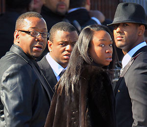 According to TMZ sources, Brown was invited, plus two, but the New Edition singer arrived to the church in Newark with an entourage of nine people, including his girlfriend Alicia Etheridge, daughter LaPrincia and son Landon.