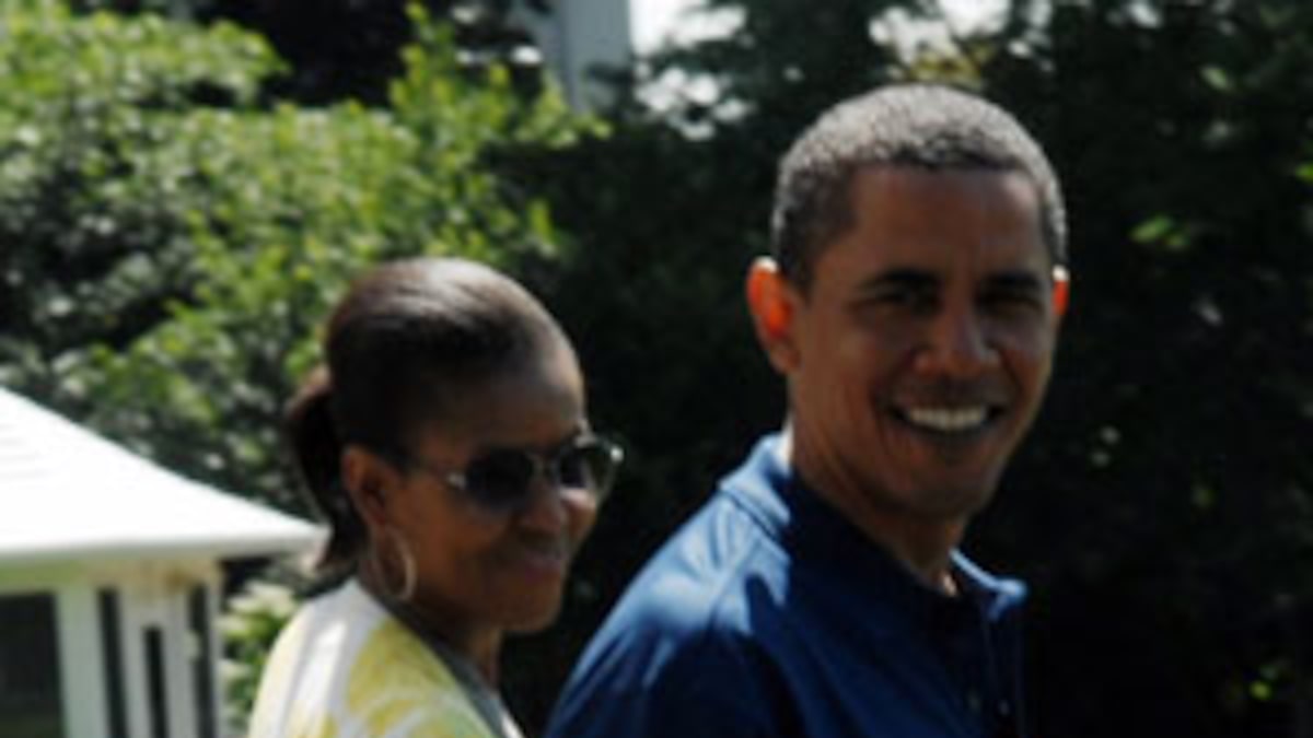 Michelle's outfit was perfect for spring in D.C. She slicked her hair back in a simple ponytail and wore a floral Liz Claiborne cardigan with a khaki GAP dress, silver flats and fashionable aviator sunglasses.