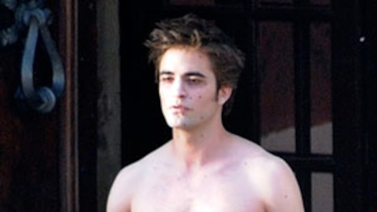 Robert Pattinson is shirtless, ladies! Yowzah! Photogs snapped this pic of the 23-year-old mega-heartthrob and his rock-hard body while shooting "New Moon" in Montepulciano, Italy.