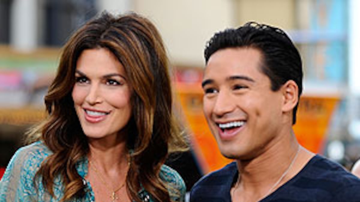 Supermodel Cindy Crawford stopped by The Grove to chat with "Extra's" Mario Lopez about skin care tips, staying happily married -- and double-dating with pals George Clooney and Elisabetta Canalis.
