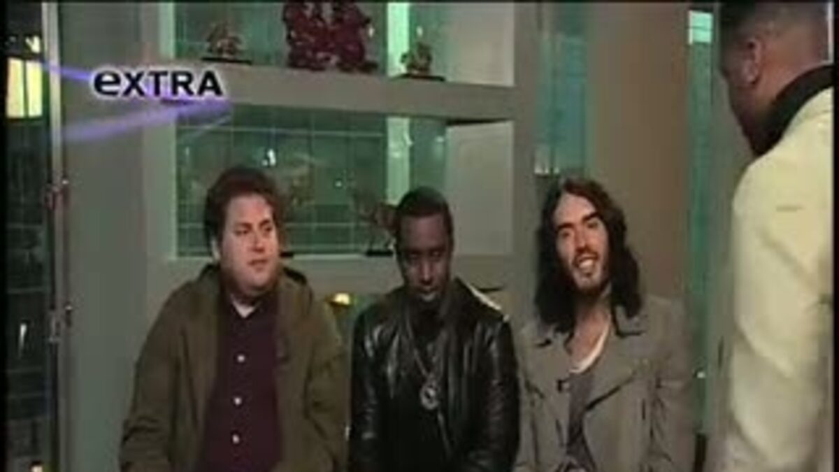 AJ Calloway talks with "Get Him to the Greek" stars Jonah Hill, P. Diddy and Russell Brand at "Extra."